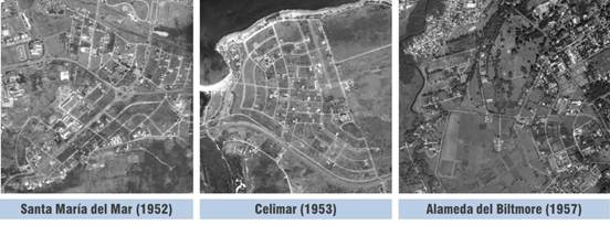 Tras estas primeras experiencias, la nueva proyección de la Revolución llevó aparejado la supresión radical el ejercicio privado de la profesión y la consecuente reducción de licencias de construcción, con mayor evidencia en La Habana [41 p.18]. Los cambios políticos y socio-económicos impactaron sobre las parcelaciones heredadas. Varias quedaron “detenidas en el tiempo”, fundamentalmente las que se encontraban en zonas que luego quedaron “congeladas” y vedada su ocupación, tanto en el oeste (Alameda del Biltmore y fragmentos de Habana Biltmore) como en el este de la ciudad (Celimar, Colinas de Villa Real, Santa María del Mar, Playa Veneciana, Brisas del Mar) (Figura 16). Constituyen hoy solo pálidas cicatrices en el terreno, todavía visibles, sobre todo desde el aire, como recuerdo de su breve existencia. Terminaba así el periodo de mayor expansión de la ciudad de La Habana en el siglo XX