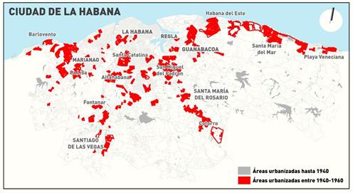 Fuera de los núcleos de atracción, el tejido urbano se caracterizó por una baja densidad y una desproporcionada extensión del hábitat de este a oeste. Los crecimientos descontrolados a través de las carreteras llevaron a un proceso de conurbación entre los históricos municipios de la ciudad. A fines de la década de 1950 la urbe ocupaba una superficie de 47 846 Ha (478 km2), el 0.3% de la superficie de la isla, concentrando el 20.5% de la población total del país y el 33.9% de la población urbana [10] (1 361 600 habitantes [1 p.214] en “La Gran Habana”8). (Figura 3)