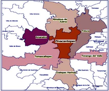 Zinacantepec es un municipio del Estado de México y se localiza al centro del valle de Toluca (Figura 1). Limita al norte con Almoloya de Juárez, al sur con Texcaltitlán, al este con Toluca y Calimaya al oeste con Temascaltepec y Amanalco de Becerra, al sureste con Villa Guerrero y Coatepec Harinas. El municipio cuenta con 48 delegaciones, cuatro se encuentran en la cabecera municipal y las 44 restantes están distribuidas en diferentes localidades. [19]