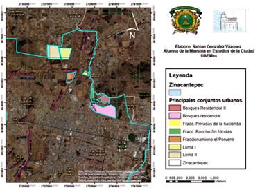 La Dirección de Desarrollo Urbano de Zinacantepec, así como la del estado de México, presenta un registro de catorce conjuntos urbanos, dato que no corresponde con los conjuntos urbanos identificados en recorridos de campo, en los que solo se identificaron veinte. Es decir, seis de éstos se construyeron, se vendieron y habitaron sin intervención de las autoridades municipales. Se verificó además que estas construcciones están favoreciendo un crecimiento urbano en zonas que no son consideradas por el Plan de Desarrollo Urbano como zonas urbanizables. (Figura 2)