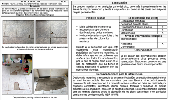 Como resultado de las primeras etapas de la metodología adoptada, fueron confeccionadas fichas de los asentamientos y las tipologías constructivas, las que reflejaron datos sobre la ubicación, materiales, soluciones y detalles constructivos, y otros datos que ayudaron en la definición del origen, posibles causas y características de las manifestaciones patológicas encontradas.