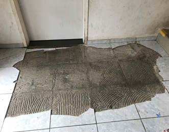 Las lesiones que más afectan a los pisos son las relacionadas con las fracturas y desprendimiento de las piezas, o de las grietas cuando los pisos son de mortero. En el caso de los pisos con piezas, más del 60% de los apartamentos que tenían esa solución presentaban daños. Esta manifestación comienza con el desprendimiento del mortero de asiento del pre piso, o entre él y las losas; y en un segundo estadio terminan por desprenderse las losas en grandes áreas, tal y como se muestra en la Figura 5.