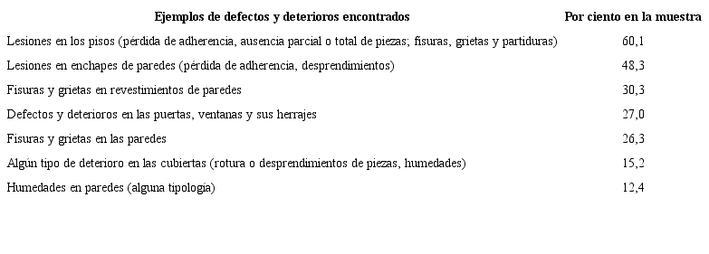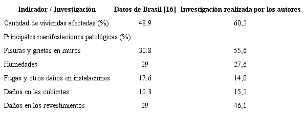 En la Tabla 2 se presentan los datos de cinco familias de lesiones que se presentan, tanto en la investigación realizada a escala de país, como en las ciudades estudiadas en este trabajo. Para otros daños, como los que aparecían en puertas y ventanas, no se contó con datos en la investigación nacional para poder hacer la comparación.