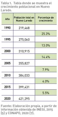 No obstante, la situación actual de Nuevo Laredo muestra a una ciudad que realmente no ha logrado aprovechar su privilegiada localización geográfica, ni salir plenamente beneficiada del crecimiento económico que suponía la implementación del TLCAN. En ese sentido Coubés [4, p.25] señala que “las grandes ciudades como Tijuana y Ciudad Juárez están del lado de las beneficiadas, en tanto que las localidades medias fronterizas de Nuevo Laredo y Matamoros aparecen, en términos de empleo, como las perdedoras del proceso”. Al mismo tiempo, también existen diversos indicadores que muestran el nivel de marginación socio-económica que experimenta actualmente esta ciudad, como el hecho de que el 22% de su población no cuenta con derecho a los sistemas de salud pública [5] lo cual representa el porcentaje más alto dentro de las principales ciudades fronterizas del norte de México. Sin duda pueden ser múltiples los motivos que estén limitando el potencial de crecimiento socio-económico en Nuevo Laredo, sin embargo, es muy posible que una de las principales causas esté íntimamente relacionada con el nivel de segregación socio-espacial que se está experimentando en dicha ciudad; básicamente existe un “rompimiento” entre el espacio urbano y sus habitantes, el cual está vinculado de manera muy clara a los altos índices de violencia que se experimentan en Nuevo Laredo. En este sentido pueden mencionarse algunas estadísticas basadas en la Encuesta Nacional de Seguridad Pública Urbana [6] que señalan de forma específica que el 75.6% de los habitantes de esta ciudad se sintieron inseguros; el 64.0% tienen miedo de salir a caminar por las noches en los alrededores de su vivienda; el 65.3% han identificado disparos frecuentes con armas en los alrededores de su vivienda, y finalmente con lo que respecta al ámbito espacial, el 99.4% detectó algún tipo de problemática urbana en su ciudad. Por otra parte, al poner en contexto las anteriores estadísticas, se observa que la tasa de crecimiento poblacional en Nuevo Laredo se ha venido desacelerando de forma muy evidente en las últimas dos décadas. (Tabla 1). Lo anterior podría explicarse por el hecho de que después de la implementación del TLCAN, esta ciudad dejó de presentarse como una de las principales opciones potenciales para recibir a la fuerza laboral, debido en gran medida a que las principales oportunidades laborales se presentaron en otras ciudades. A esto se suman las condiciones de inseguridad que han venido imperando en las últimas dos décadas, y probablemente también de una forma secundaria, pudieran influir otro tipo de factores relacionados por ejemplo, a la falta de calidad de su imagen urbana.