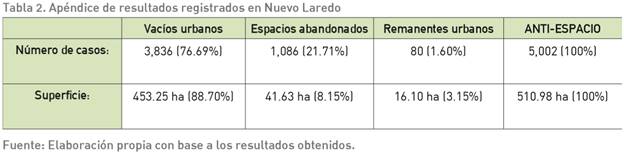 Para lograr dicho objetivo se planteó una metodología orientada a la conformación de un área de estudio que abarcara la mayor parte de la zona urbana de Nuevo Laredo, y en base a ello fue posible registrar y cuantificar el total de superficie territorial considerada como inutilizada. Específicamente los resultados quedaron expresados a nivel gráfico mediante una serie de modelos espaciales que muestran los patrones de distribución de este fenómeno, mientras que los resultados cuantitativos mostraron los porcentajes individuales que corresponden a cada una de las tipologías del anti-espacio urbano (vacíos urbanos, espacios abandonados y remanentes urbanos). Cabe señalar que se trata de una investigación longitudinal desarrollada en un periodo de tiempo específico, concretamente la recopilación de los casos prácticos se llevó a cabo entre los meses de diciembre del 2019 y abril del año 2020.