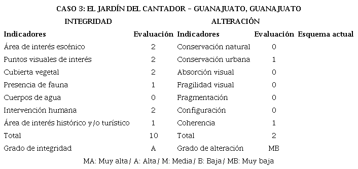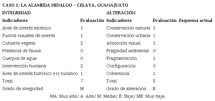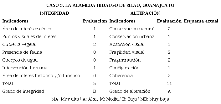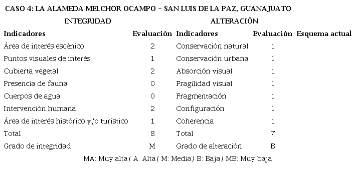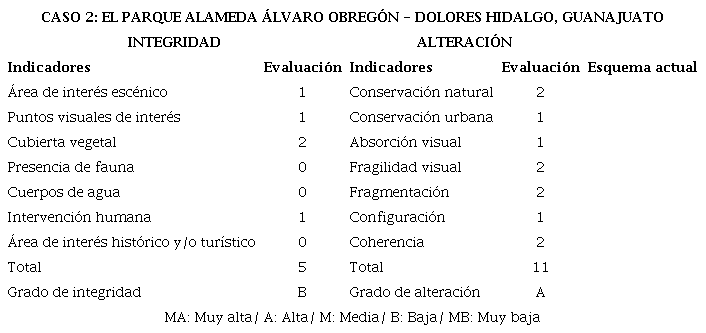En la Tabla 4 se presenta un resumen de la evaluación de la Alameda Obregón- Dolores Hidalgo a partir de la metodología propuesta.