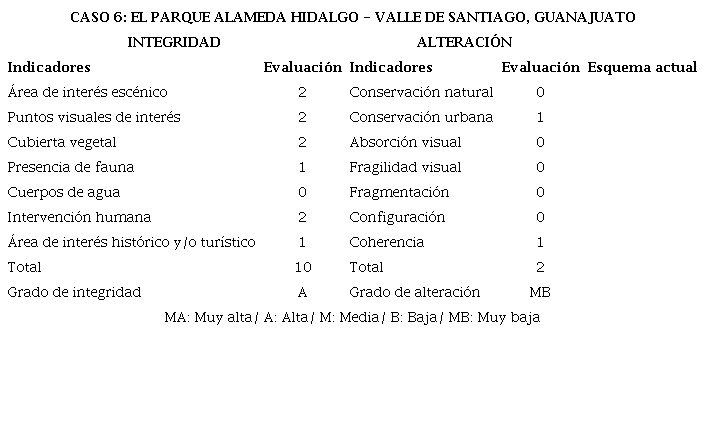 En la Tabla 8 se presenta un resumen de la evaluación de El Parque Alameda Hidalgo - Valle de Santiago, a partir de la metodología propuesta.