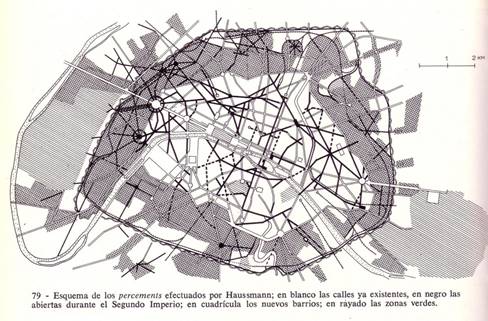 La transformación de París durante el Segundo Imperio de Napoleón III (1852-1870) a manos de Georges-Eugène Haussmann, vino dada por la epidemia del cólera y el hacinamiento, llevando a la renovación de la ciudad (Figura 5), lo que requirió la demolición de barrios medievales, de la construcción de nuevas plazas y parques, de acueductos, de avenidas más anchas a las existentes, de nuevos sistemas de plomería y alcantarillado, además de la creación de nuevas leyes de zonificación para evitar el hacinamiento [3].