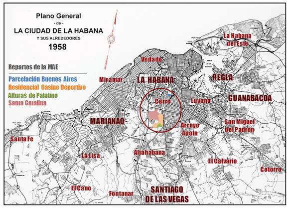 El presente trabajo muestra resultados parciales de una investigación mayor, dirigida a visibilizar el patrimonio poco explorado del Movimiento Moderno habanero. Se tomó como objeto de estudio la arquitectura representativa de cuatro repartos surgidos en la década de 1950 en el territorio del actual municipio Cerro (en lo adelante, Zona de Estudio): Parcelación Buenos Aires, Residencial Casino Deportivo, Alturas de Palatino y Santa Catalina. Esta investigación tuvo un acercamiento inicial en 2017 [12] y resultados parciales posteriores [13, 14]1, como paulatinos intentos de sacar a la luz este valioso patrimonio. (Figura 1)