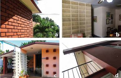 Para acentuar determinados aspectos de la expresión formal, algunos muros se trabajaron con texturas superficiales, ya fueran calados o salientes, se variaba la posición de las piezas de fábrica que lo componían; alternaron secciones con distintos espesores, generalmente asociados a paños de carpintería; y algunos no portantes se concibieron como celosías, construidas con ladrillos o bloques y variados diseños, cuya porosidad favorecía el confort climático. (Figura 10) En casos excepcionales, los muros portantes también fueron calados, aunque solo parcialmente, y se complementaban con pórticos o columnas en las áreas donde se requería transparencia espacial. Los pórticos, de hormigón armado, poseen elementos de sección ortogonal, y las columnas no integradas a ellos son generalmente de igual material o metálicas, rectas o inclinadas y sus secciones cuadradas, rectangulares o circulares.