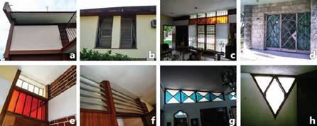 Según el estándar de la vivienda, las variaciones principales se observan en la forma, las dimensiones y la ubicación en las fachadas. Las puertas más usadas fueron de una o dos hojas, plegadas o de corredera. Para las ventanas se recurrió frecuentemente a persianas Miami, con o sin lucetas, o combinadas con paños de vidrio transparentes o de colores. (Figura 13)