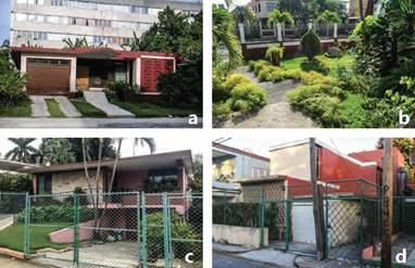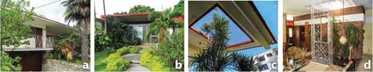En jardines y fachadas frontales, atendiendo a sus características físico- morfológicas, las plantas elegidas respondían a los códigos usados para la jardinería por el Movimiento Moderno. En clara alusión a la influencia norteamericana, se observa la presencia de plantas exóticas, no autóctonas, generalmente estilizadas, y con notable desarrollo vertical (ejemplo: araucarias y palmas delgadas), en contraposición y equilibrio con la horizontalidad de la arquitectura a la que se integra. En patios interiores, es común el uso de plantas de desarrollo vertical, para ser observadas desde el exterior, y del sotobosque tropical, como malangas y coberturas de sombra, capaces de responder adecuadamente al clima del lugar. En patios traseros, es frecuente encontrar plantas condimentosas, aromáticas y frutales. (Figura 14)