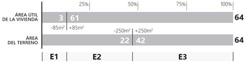 Como resultado, y luego tras considerar la diversidad de patrones que condicionaron el desarrollo de la arquitectura en la ZE3, para este estudio se decidió tomar como base de la clasificación dos elementos calificadores de la vivienda económica: el área útil de la vivienda y el área del terreno donde se asienta, lo que permitió acotar límites y agrupar las viviendas según la gradación de su estándar como se indica a continuación: