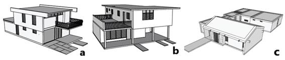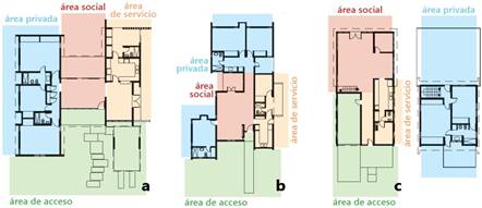 En todos los casos, se logra la diferenciación espacial entre las áreas de uso social, privado y de servicio, generalmente identificables en la solución volumétrica. Cobran importancia las áreas de acceso, compuestas por los espacios conectores entre la franja vial y el interior de la vivienda (portales, terrazas, vestíbulos y estacionamientos vehiculares). En las viviendas de más de una planta, la comunicación vertical adopta dos soluciones básicas: o posee un espacio propio o se inserta en otro, generalmente de uso social y en ambos casos se emplaza en una zona céntrica del inmueble. (Figura 8)