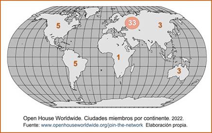 En 2022 la comunidad la integran cincuenta ciudades participantes en la red [3], en cuya distribución continental (Figura 1) se aprecia que la gran mayoría, un 66 %, son ciudades europeas, quedando mucho camino por andar no solo en África, sino también en América, donde sus valores arquitectónicos y urbanos siempre están presentes en la formación de los arquitectos en cualquier universidad del mundo.
