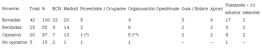 Los encuestados respondieron a estas preguntas abiertas: ¿Cómo conoció y qué le motivó a participar en Open House? ¿Dedicó un tiempo importante, antes, durante o después del evento? ¿Estas actividades son de interés para la población? ¿Están suficientemente divulgadas por los medios de comunicación? ¿Cómo considera el apoyo recibido de la organización para su preparación y desenvolvimiento del papel en el que participó? ¿Qué opina de la participación de personas no formadas en Arquitectura, Urbanismo u otras especialidades afines como guías del Festival? ¿Open House es una vía de conocimiento y concienciación del valor patrimonial de la ciudad y su Arquitectura de cara a la población? ¿Se pone en valor la ciudad con este festival de cara a sus residentes, o resulta un estorbo? ¿Recomendaría organizar Open House en otras ciudades? ¿De qué dependería? ¿Qué beneficios le ha reportado, en lo personal y lo profesional, participar en Open House?
