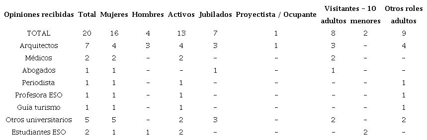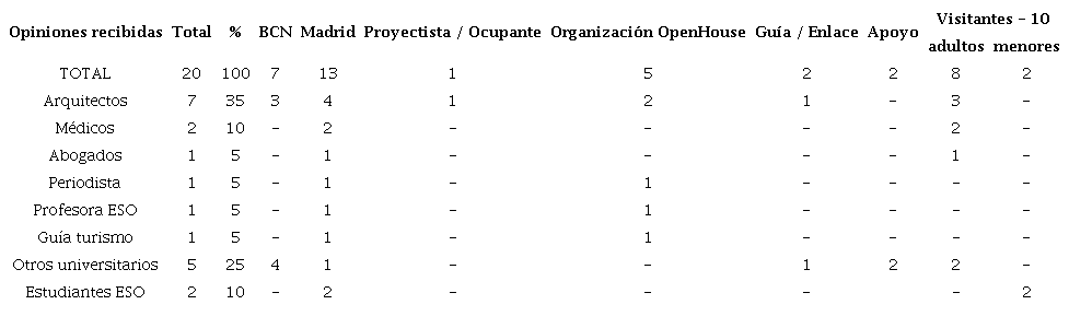 Resulta interesante la diversidad de la formación y procedencia de los encuestados, y muy particularmente, la de dos estudiantes de la enseñanza secundaria (ESO) que participaron en una visita del Open House Madrid 2021, no concebida especialmente para adolescentes. (Tabla 1) (Tabla 2).