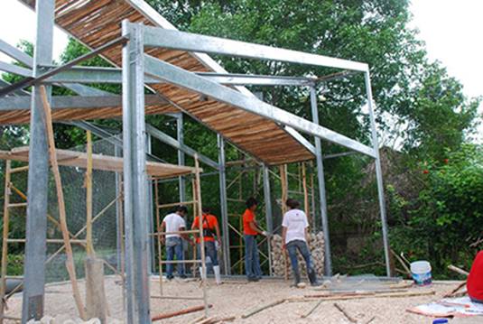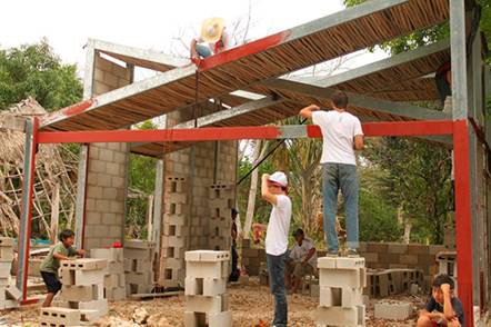 Los voluntarios y pobladores, una vez concluidos los marcos, procedieron a forjar las techumbres, cuyo diseño consistió en una parrilla de bajareque local sobre el cual se colocó un liner impermeabilizante y mortero (Figura 6).