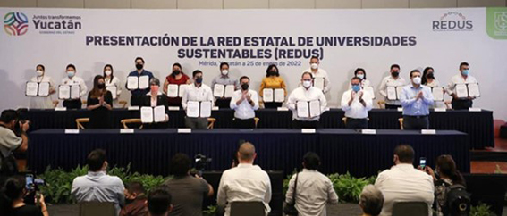 El compromiso de la Universidad con la sustentabilidad también se manifiesta en la participación del Campus en la Red Estatal de Universidades Sustentables, un grupo de quince Instituciones de Educación Superior convocadas por el Gobierno del Estado de Yucatán, quienes se comprometen a realizar acciones de sustentabilidad en 6 rubros, a saber: 1. Energía Asequible 2. Manejo y uso de los recursos 3. Infraestructura bioclimática 4. Compras sustentables 5. Innovación y 6. Cultura y consumo sustentable. Se han delineado las primeras acciones con indicadores y parámetros concretos, establecidos por la Dirección de Visión Global y Sustentabilidad del Campus (Figura 2).