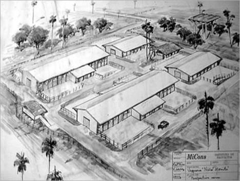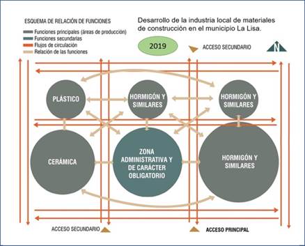 Enrumbamos su trabajo en esa línea, en la que debía proyectar la instalación industrial en forma de un combinado (Figura 4) donde se concentrarían las producciones de diversos tipos de materiales [3]. Por los resultados que obtuvo la estudiante, llego a la conclusión de que la formación de pregrado de arquitectura es correcta e integral. Su propuesta del Combinado industrial la consideramos como la base conceptual de las aspiraciones del municipio.