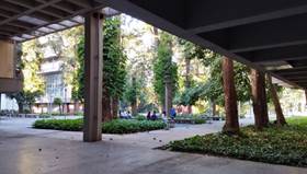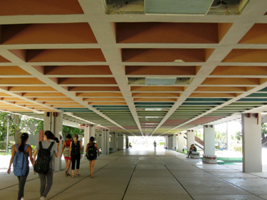 El proyecto propició el uso racional del suelo, evitando la expansión excesiva del conjunto. Los taludes que se crearon como resultado de la adaptación a la topografía, conjugados con escalinatas que se integran con las áreas exteriores, constituyen otro rasgo identificador del campus. Así, a través de todo el complejo se va subiendo o bajando según se requiera, lo que crea un recorrido variado, del que merece mencionarse el llamado Paso de los vientos (Figura 6), como acogedor espacio de circulación y también de descanso.