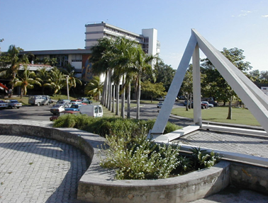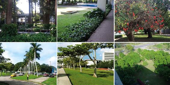 “… Entre las especies se pueden mencionar las plantaciones con herbáceas no cespitosas que cubren los taludes, como laderas umbrosas, son coberturas y marcan los pavimentos y caminos. También están las plantaciones con arbustos que constituyen en ocasiones cierres virtuales en los que se usan las especies coquito de Brasil en formato de macizos, o también Seto de Bougainvillea spectabilis, plantaciones con diferentes tipos de palmas, según la función que se quiere identificar donde se colocan y también plantaciones con árboles en plazas y parques, entre ellas la Arboleda de Grevillea robusta, Alineación de Sterculia apetala, Grupo de Erythrina abbysinica, así como un ejemplar aislado de Tabebuhia rosea en los jardines entre el edificio de la Biblioteca y aulas de Eléctrica, en la zona aledaña al teatro central…”11 (Figura 7)