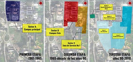 Durante esa primera etapa, entre 1961 y 1965, se ejecutaron y concluyeron los edificios docentes y espacios de la zona que se conoce como campus principal, o zona más antigua. A lo largo de una segunda etapa, de 1965 a finales de la década de los años 90, se ejecutaron varias edificaciones de apoyo a la docencia y en lo que podría considerase una tercera etapa, entre finales de los años 90 y 2010, se terminó el edificio inconcluso colindante con el comedor de becados, para realizar el Complejo de Investigaciones Tecnológicas Integradas (CITI), que se inauguró en 2010 y se repararon las cinco cocinas- comedor por parte de un equipo integrado por profesionales de distintas facultades, dirigido por Gabriela Peterssen y Mabel Matamoros [10]. Del 2010 al presente 2024 se han continuado acciones de rehabilitación y mantenimiento a las edificaciones y a sus espacios exteriores. (Figura 3)