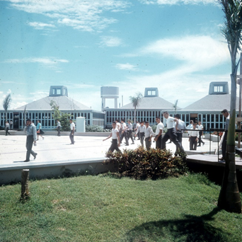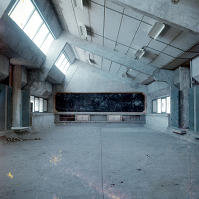 Este espacio del Instituto fue su área de formación por excelencia. Seguía el esquema funcional de toda institución escolar cubana, y funcionaba además como eje pivotante del conjunto y como centro donde se desarrollaba la vida social, cultural y pública de aquella Ciudad Juvenil (en: Figura 4, no.1). Se encontraba en un sitio de notable centralidad, junto a los tres comedores, el anfiteatro techado y el edificio de servicios, en el centro geométrico de la escuela, formando una UF donde se desarrollaba la vida comunitaria de la institución.