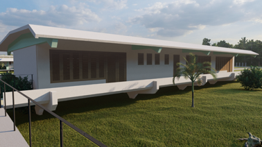 Su cubierta era plana y bordeada por amplios aleros inclinados a 45˚ que sugería, intencionalmente, la techumbre de los bohíos tradicionales cubanos. Estos salientes apoyaban sobre ménsulas triangulares, como cartabones, que acentuaban su función, caracterizando de manera singular la expresión formal de la edificación. Contaba con un gran vano de acceso que se comunicaba directamente con la dirección y con el parqueo, permitiendo de este modo el acceso de ambulancias en casos de emergencias. (Figura 12)