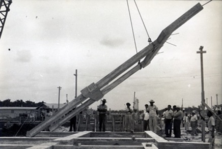 En colaboración con técnicos del Regional Mayabeque 15, se decidió utilizar el sistema de prefabricación total para la construcción a pie de obra, siendo el Instituto Tecnológico de Suelos y Fertilizantes André Voisin, una de las primeras obras en usar la prefabricación in situ en Cuba en la etapa revolucionaria 16. Para ello, se diseñaron elementos simples que se pudieran apilar y hormigonar de manera repetitiva, lo que permitió llevar adelante la construcción de forma simultánea junto con el trazado, las excavaciones y el montaje, asegurando la finalización de la obra en el tiempo establecido. (Figura 20)