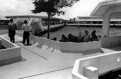 La unidad norte fue la primera en ser concluida, en la cual se pueden apreciar soluciones técnicas diferentes a las dadas para la unidad sur [14]. Cada edificio de aulas teóricas, de 27,45 m x 12,20 m, estaba dividido en tres salones, cada uno con capacidad para 30 estudiantes, para que un total de 90 alumnos recibieran docencia simultáneamente (en: Figura 4, no. 9). Estos módulos poseían pasillos de circulación laterales al exterior que conectaban el paso de manera expedita desde y hacia los dormitorios y los baños, además servían para la estancia de los estudiantes, en momentos de receso docente. (Figura 8)