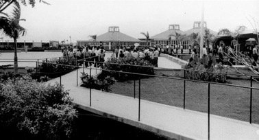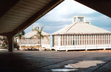 Su conexión con el acceso principal al Instituto, a través de pasarelas aéreas o no, estuvo jerarquizado con la interposición de un parque de forma oval con bancos, espacio que era sitio para el simbólico busto de André Voisin, lugar al que se llegaba también desde el punto de acceso por la vía exterior del norte. Esta plaza estaba jerarquizada por los volúmenes de los comedores y el anfiteatro techado, piezas que, por su expresión formal, acentuaban la centralidad del conjunto y su carácter urbano. (Figura 5)