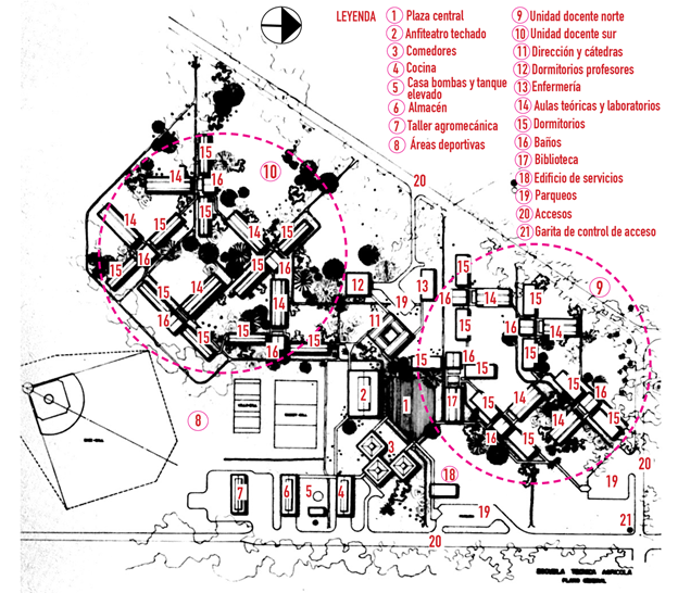 Los recintos docentes estaban agrupados en dos conjuntos o unidades. Cada unidad se organizaba en cinco módulos, compuestos por: aulas, dormitorios y baños. Por su parte, cada uno de los módulos se estructuraba a partir de un cuerpo central cuadrado que contenía los baños, y una nave rectangular de aulas teóricas y laboratorios, formando un eje. Perpendicular a este eje y en ángulo recto al mismo, por el núcleo sanitario, se unían dos naves rectangulares de dormitorios para estudiantes, una a cada lado, todos formando una planta en un esquema con forma de T. repetidas y giradas a 45o y 90o entre sí. [14] (Figura 7)