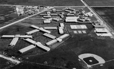 Para atender la formación física de los jóvenes, el conjunto contaba con un amplio parque deportivo formado por: dos canchas de baloncesto, tres de voleibol, y un campo de béisbol, todos siguiendo las normas técnicas establecidas entonces para la práctica de estos deportes por los jóvenes becarios. (en: Figura 4, no. 8)
