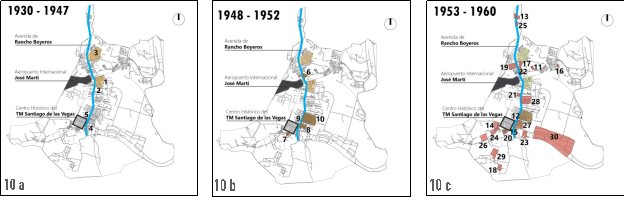 Primer periodo: 1930-1947. Inicio marcado por la inauguración del Aeropuerto Internacional de La Habana y la ejecución del reparto Lutgardita, hasta la aplicación del Decreto No. 613 de 1946, que estableció reglas sobre las parcelaciones suburbanas. (Se documentaron 5 urbanizaciones) (Figura 10a)