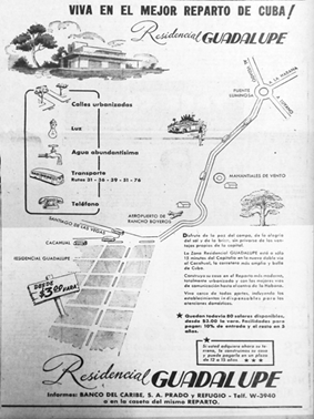 A partir de la década de 1950 se incrementa la propaganda para atraer potenciales familias a adquirir propiedades en los nuevos repartos del territorio, con anuncios donde se acentuaba, mediante dibujos y pequeños esquemas, tanto la cercanía a La Habana como al Aeropuerto, siendo la Avenida de Rancho Boyeros la principal conectora. (Figura 20) También se apuntaba que los nuevos hogares dispondrían de las ventajas de la vida moderna: luz eléctrica, servicios de gas y de telefonía fija. Ranchos Naroca, por ejemplo, promocionaba el uso de una infraestructura eléctrica soterrada, en cumplimiento de la Ordenanza Municipal del término [27, Segunda Sección, Artículo 12] y grandes espacios públicos, pues se vendía como sitio ideal de veraneo para las familias ricas de La Habana.
