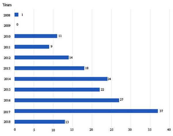 As YouTube was created in 2005, the temporary line of the analysed papers goes from 2005 to April 2018. As shown by the number of articles published (Fig.), YouTube is increasingly becoming a primary source of analysis, and it is likely that there will be more video content assessment methods in future research. Therefore, it is necessary to establish homogeneous and standardised content assessment systems. Furthermore, for comparison and repetition of research, papers should provide a complete list of analysed videos. Of all reviewed papers, only 19 (10.79 %) provided such a list.
