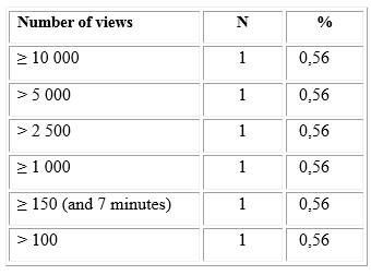 Regarding inclusion or exclusion criteria, there is no exact criterion that permits the definition of a parameter to choose videos with a particular number of views. This parameter is very scattered. As shown in table 2, the number of views as a criterion is shown in just six studies (3.40 %). In fact, there is no criterion of certainty that indicates how many views were required for a video to be included in a study. There are many parameters in which the views were counted because YouTube counts the quality views, but there are no established criteria for how a view is counted regarding viewing time. This means that it might make sense to include videos with fewer views in any research study.