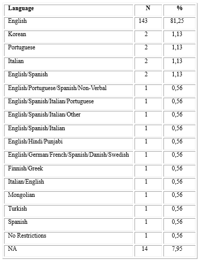 Language was another criterion of inclusion or exclusion. The main language of choice for the videos was English, and there is little variety in the analysis of videos in other languages. Nineteen studies (10.79 %) chose a different language such as Finnish, Greek,28 Mongolian,29 Korean30 and Italian.31 Because working teams were international, there were a combination of languages (table 3). Fourteen studies (7.95 %) did not indicate in which language the videos were published, but we can infer that it was English because of other information found in the paper. These data indicate that there is a need for content analysis in languages other than English.