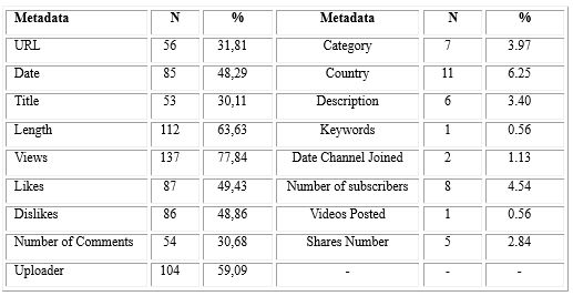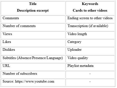 YouTube, like other social network sites, captures different metadata and public metrics. Metadata has varied since YouTube was created, and each study captured different metadata, depending on what was evaluated. Table 4 presents the metadata and metrics that can be captured on YouTube.