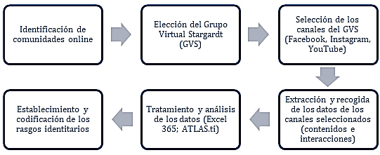 De los canales del GVS se seleccionaron solo los de acceso público, concretamente su página en Facebook, su perfil en Instagram y su canal en YouTube. Se consideraron productos de Comunicación Interactiva en Salud, y por tanto se analizaron como tales los contenidos de las entradas y comentarios. Se recogieron todos los vídeos de YouTube y publicaciones de Instagram, con sus correspondientes descripciones y reacciones. En el caso de Facebook, por el gran volumen de publicaciones existentes, se optó por recopilar las publicaciones del año 2018 y sus comentarios. Se usó la aplicación Netvizzc para la recogida automática de los datos de Facebook, mientras que en el resto de medios se procedió de manera manual. Este proceso se realizó el 5 de enero de 2019 y se recogió un total de 42 vídeos de YouTube, 18 publicaciones de Instagram y 70 posts de Facebook. Para el tratamiento de los datos se utilizó Excel 365 y el análisis de estos se realizó con el programa ATLAS.ti. La figura 1 ilustra los pasos seguidos en la metodología de este trabajo.