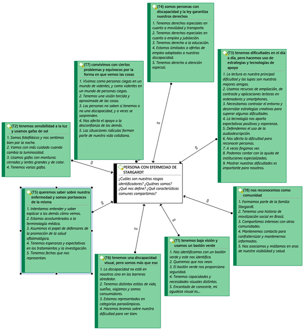 En la figura 2 se muestran los rasgos identificadores, que indican los distintos aspectos representados para cada uno de ellos. En concreto, son los siguientes: (T1) tenemos baja visión y usamos un bastón verde; (T2) tenemos sensibilidad a la luz y usamos gafas de sol; (T3) tenemos dificultades en el día a día, pero hacemos uso de estrategias y tecnologías asistenciales; (T4) somos personas con discapacidad y la ley garantiza nuestros derechos; (T5) queremos saber sobre nuestra enfermedad y somos portavoces de esta; (T6) tenemos una discapacidad visual pero somos más que eso; (T7) convivimos con ciertos problemas y contradicciones por la forma en que vemos las cosas; y (T8) nos reconocemos como comunidad.