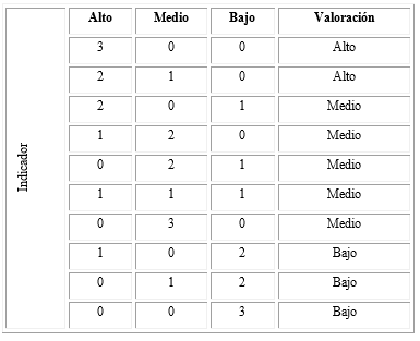 El sistema de indicadores modificado mantuvo la cantidad de dimensiones, variables e indicadores propuestos por Elías-Hardy, González-Olaguive y Martínez-Martínez,2) por lo que la evaluación de las variables en las categorías y rangos declarados se mantiene. Como puede apreciarse en el cuadro 2, hay variables que se estudian a través de un solo indicador (Competencia del Experto, Liderazgo, Organizacional y Etapas del Tránsito del Conocimiento) y los resultados que se obtienen en dichos indicadores permiten evaluar directamente la variable en las categorías y rangos declarados. Para el caso de las variables que tienen tres indicadores (Carrera Profesional del Experto, Visibilidad y Proyección Nacional e Internacional, y Docencia) se propuso su valoración integral a partir de las consideraciones declaradas en la cuadro 3. La cifra que aparece en cada columna expresa la cantidad de indicadores valorados con la categoría correspondiente donde se encuentra ubicada.