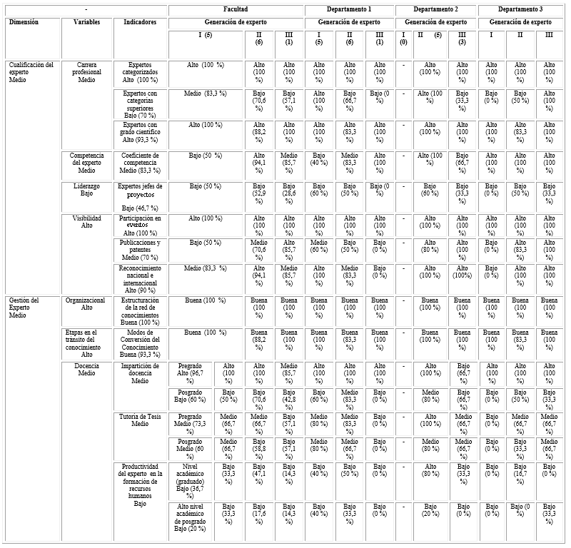 Las variables con alto desarrollo en la facultad fueron la visibilidad nacional e internacional del experto, la gestión organizacional con una buena estructuración de la red de conocimiento y un modo predominante de exteriorización y combinación del ciclo de creación del conocimiento organizacional según el modelo de Nonaka y Takeuchi.5 Se observa que el liderazgo resultó la variable con más bajo desarrollo, pues solo el 46,7 % de los expertos dirigen grupos de trabajo. Por otra parte, los indicadores que tienen bajo desarrollo son expertos con categorías superiores y productividad del experto en la formación de recursos humanos, tanto de grado como de posgrado. Los datos presentados permiten establecer en una forma visual cómoda el grado de desarrollo de cada indicador, variable y dimensión, lo que facilita la determinación de los indicadores con bajo grado de desarrollo. Por otra parte, al mostrar los resultados alcanzados en cada departamento y generación, se puede establecer la incidencia de cada uno en el resultado global de la facultad. Por ejemplo, obsérvese que el bajo desarrollo en la facultad del indicador “Expertos con categorías superiores” responde al bajo desarrollo en las generaciones II y III de dos departamentos, y ausencia de docente de la generación I en un departamento. En el bajo desarrollo de la variable “Liderazgo” influyen los bajos niveles alcanzados en todas las generaciones de los tres departamentos.