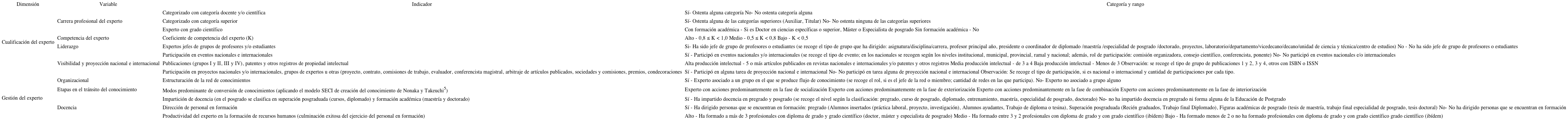 Se calculó, además, el rango intercuartílico (k) como diferencia entre el tercer y primer cuartil, con el objeto de medir la dispersión de la muestra. Esta fue inversamente proporcional al consenso grupal (a mayor rango, menor consenso).2 En este contexto, la unanimidad se consiguió cuando k= 0 y se estimó un grado de convergencia aceptable (consenso) entre los expertos cuando k ≤ 1. Los participantes en el panel de expertos tuvieron consenso sobre las dimensiones y la tabla para la valoración de las variables con tres indicadores. También hubo consenso en relación con la correspondencia de las variables a la dimensión definida, excepto en el caso de liderazgo (k= 3). La contribución de los indicadores a la medición de la variable con la que se ha relacionado no alcanzó consenso para “Categorizado con categoría docente y/o científica” (k= 1,5), “Reconocimiento nacional” (k= 1,5) y “Modo predominante de conversión del conocimiento” (k= 3). Los indicadores individuales con menor consenso fueron “Categorizado con categoría docente y/o científica” (k= 2,5) y “Modo predominante de conversión del conocimiento” (k= 1,5), mientras que el indicador colectivo con menor consenso fue “Coeficiente de competencia del experto” (k = 3).