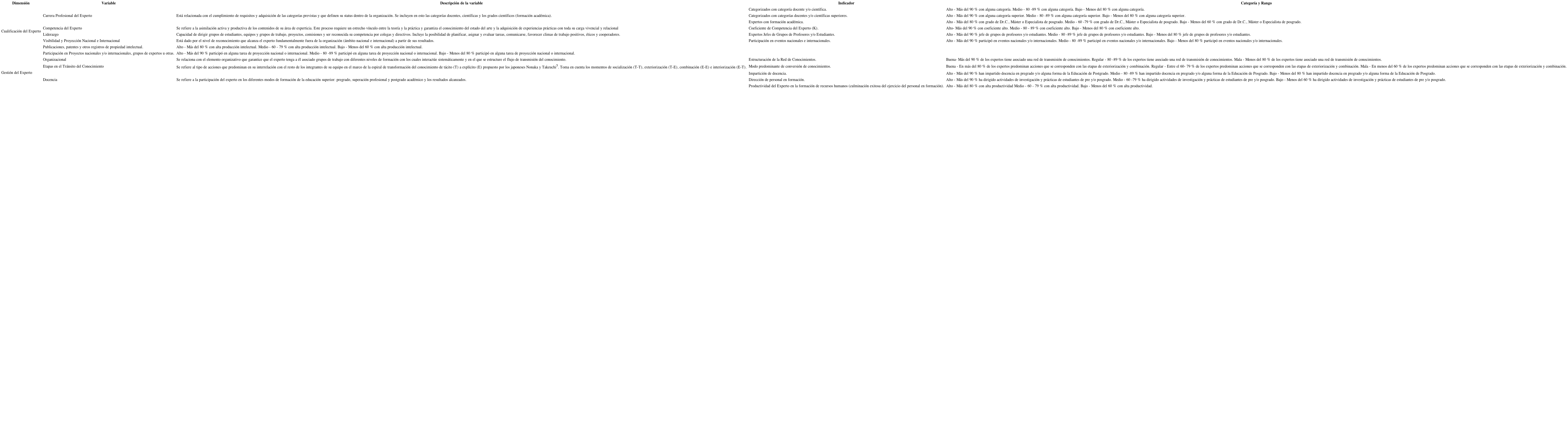 Las modificaciones realizadas al sistema de indicadores diseñado para la valoración de los expertos que laboran en una entidad de ciencia, tecnología e innovación permiten adecuarlo y aplicarlo para la valoración de los expertos docentes - investigadores que laboran en una universidad. Se modifican indicadores de tres variables de la dimensión “Cualificación del experto” (carrera profesional, liderazgo y visibilidad nacional e internacional) y de la variable “Docencia” correspondiente a la dimensión “Gestión del experto”.