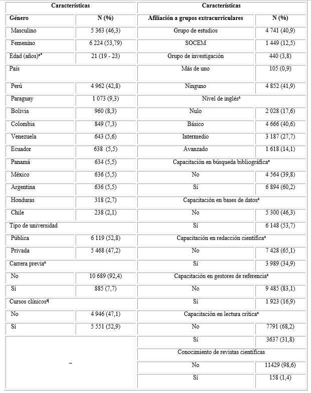 De un total de 11 587 participantes (Tabla 1), la mediana de edad fue de 21 años y el 53,8 % era del sexo femenino (n= 6 224); el 52,8 % pertenecía a la universidad pública (n= 6 119); el 52,9 % cursaba años de carrera clínicos (n= 5 551) y el 12,5 % estaba afiliado a una SOCEM (n= 1449). En cuanto a las capacitaciones recibidas, solo dos de ellas fueron reportadas en más del 50 % de los estudiantes, las cuales correspondieron a la capacitación en búsqueda bibliográfica (60,2 %) y en bases de datos (53,7 %). Solo el 1,4 % presentó conocimiento en revistas científicas médicas (n= 158).