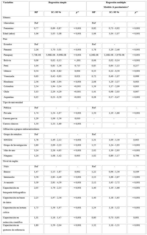 RESUMEN: Las revistas científicas son uno de los medios de difusión científica más importantes para la ciencia, y su papel en el avance de la medicina es crucial. El objetivo de este estudio fue determinar los factores asociados al conocimiento de revistas científicas en estudiantes de medicina de 40 escuelas en Latinoamérica. El diseño realizado fue transversal de análisis de datos secundarios. Se definió el conocimiento de revista científica si el estudiante respondía correctamente al nombre de cualquier revista científica. Se obtuvieron valores p mediante modelos lineales generalizados multinivel de efectos mixtos. De 11 587 participantes, la mediana de edad fue de 21 años y el 53,8 % era del sexo femenino. Solo el 1,4 % reportó conocimiento en revistas científicas. Se asociaron a una mayor frecuencia de conocimiento de revistas científicas la edad en años (RP= 1,06; IC: 95 %: 1,04-1,07); estudiar en universidad privada (RP= 1,50; IC: 95 %: 1,19-1,66); estar afiliado a una sociedad científica (RP= 1,31; IC: 95 %: 1,09-1,56); el grupo de investigación (RP= 1,55; IC: 95 %: 1,24-1,93) y más de 1 grupo extracurricular (RP= 2,02; IC: 95 %: 1,39-2,93), así como reportar nivel de inglés intermedio (RP= 2,12; IC 95 %: 1,68-2,67) y avanzado (RP= 2,12; IC 95 %: 1,65-2,72); la capacitación en la búsqueda bibliográfica (RP= 1,40; IC: 95 %: 1,19-1,66); la base de datos (RP= 1,40; IC 95 %: 1,18-1,52); la lectura crítica (RP= 1,34; IC: 95 %: 1,18-1,52) y los gestores de referencia (RP= 1,32; IC 95 %: 1,16-1,51). Se concluye que el conocimiento de revistas científicas parece incrementarse en estudiantes entrenados en investigación y afiliados a grupos científicos. Se recomienda reforzar las habilidades científicas-académicas esenciales en la formación médica.