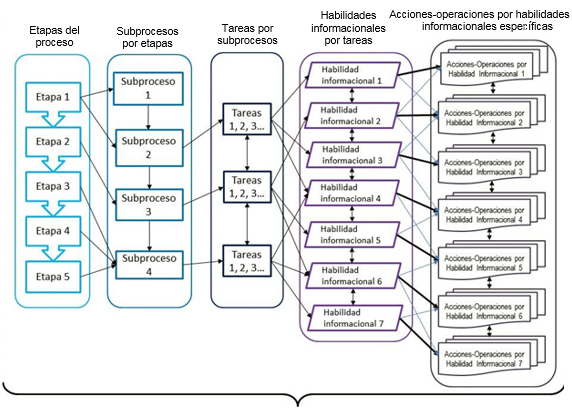 Estas tareas requieren del uso de la información científica, pero no se realizan de forma lineal, pues están vinculadas entre sí y se pueden realizar varias al mismo tiempo o estar en una y volver a otra en la que se trabajó anteriormente. Por ejemplo, en el subproceso 4, la tarea “Propuesta de solución de la investigación” requiere volver a la tarea “Presentación de los resultados teóricos y empíricos del objeto y el campo de la investigación”. También el doctorando puede realizar varias tareas de otros años en uno solo. Por ejemplo, la tarea “la publicación de un artículo” y “la participación en un evento” pueden realizarse en cualquiera de los años, aunque la media indica que ocurre a partir de segundo año de la formación. Estas características del proceso de formación doctoral permiten observar la estrecha relación entre las tareas y las etapas, lo que le confiere carácter sistémico y vincula el desarrollo progresivo de las habilidades informacionales por las etapas del proceso. Esta relación se materializa en un sistema de acciones que tributa a la interrelación de actividades teóricas y prácticas del doctorando, conformadas por las acciones y operaciones que debe realizar en las habilidades informacionales para lograr cumplir con las tareas que requieren el uso de la información científica (Fig. 2).