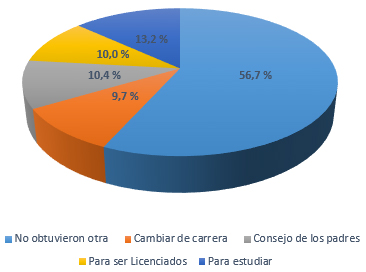 Cuando se indagó en torno a los motivos para ingresar en la mencionada carrera, los resultados fueron los siguientes: El 56,7 % declaró que no obtuvieron la carrera que querían, entre las cuales se encuentran: arquitectura, derecho, diseño, ingenierías (en especial la de informática), telecomunicaciones. El 9,7 % aspiraba a cambiar de carrera cuando culminara el primer año. El 10,4 % ingresó por consejo de los padres. El 10,0 % para ser licenciados, y el 13,2 % porque tenía deseos de estudiar (Fig. 1).